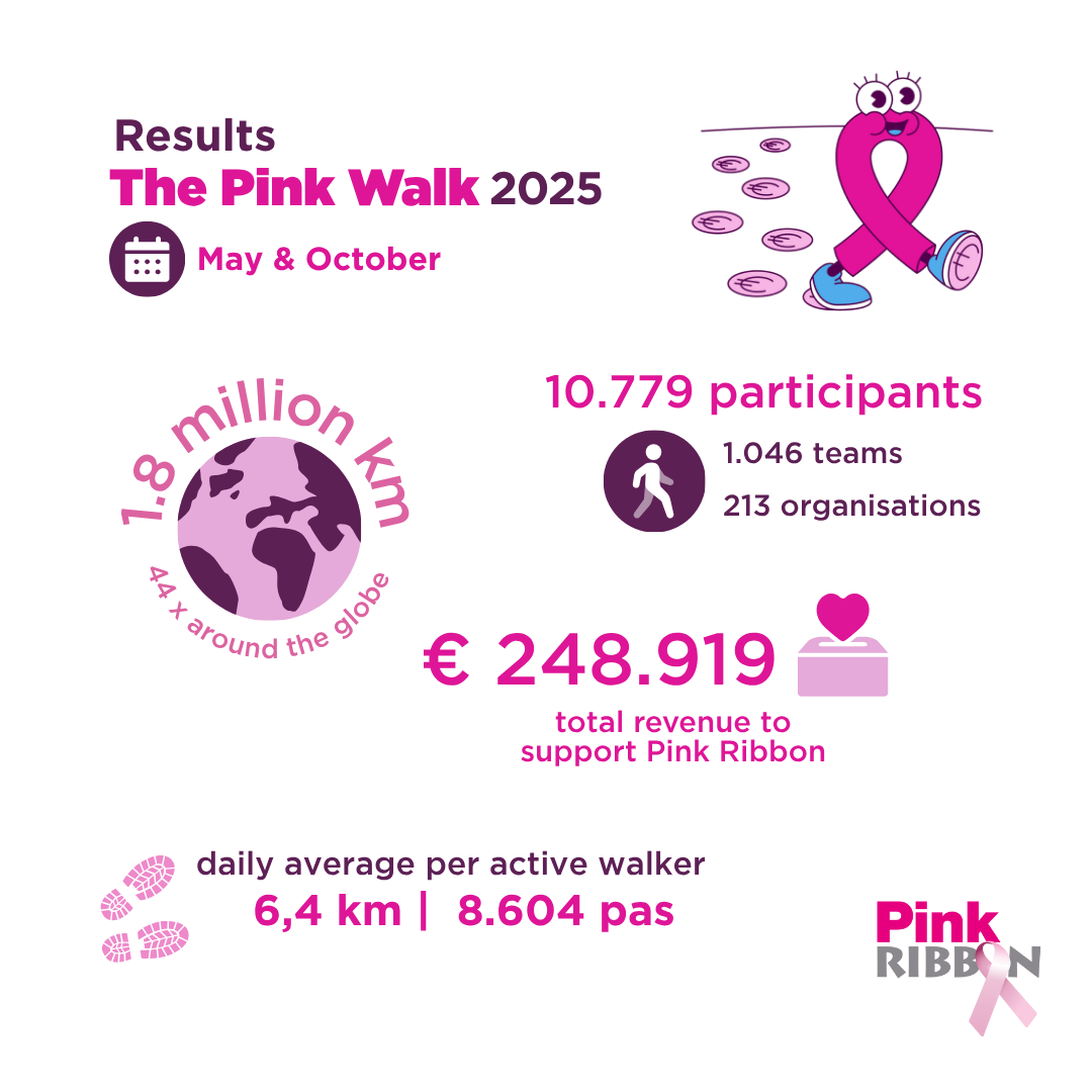 In 2025, we organised two editions of De Roze Mars. In May and October, 10,779 participants walked around the world no fewer than 44 times.