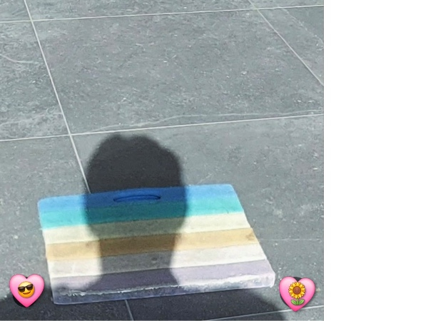 Ik had het knie-matje mee van mijn overleden va en vroeg me af: hoe dikwijls heeft hij als vloerder/marmerbewerker hier knielend op neer gezeten om alweer iemand zijn vloer te leggen. De kleuren van zijn matje zijn verbleekt en versleten, zoals hij op het einde was..