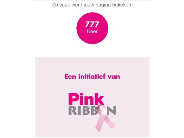 Hallo, ik wandel mee met de twaalfde editie van De Roze Mars, een initiatief van Pink Ribbon, de nationale organisatie in de strijd tegen borstkanker. Gedurende de maand oktober zal ik ernaar streven om dagelijks meer te wandelen en meer te bewegen. Omdat de strijd tegen borstkanker nog lang niet gestreden is, draag ik via deze weg mijn steentje bij. Wil je mij aanmoedigen voor deze uitdaging? Dat kan door een donatie te geven, groot of klein. Een dikke dankjewel voor je steun namens mij en het Pink Ribbon-team!