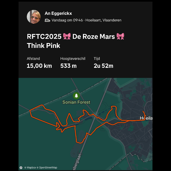 Hallo, ik wandel mee met de twaalfde editie van De Roze Mars, een initiatief van Pink Ribbon, de nationale organisatie in de strijd tegen borstkanker. Gedurende de maand oktober zal ik ernaar streven om dagelijks meer te wandelen en meer te bewegen. Omdat de strijd tegen borstkanker nog lang niet gestreden is, draag ik via deze weg mijn steentje bij. Wil je mij aanmoedigen voor deze uitdaging? Dat kan door een donatie te geven, groot of klein. Een dikke dankjewel voor je steun namens mij en het Pink Ribbon-team!